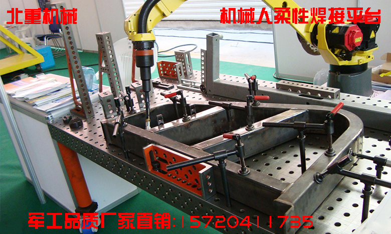 柔性組合工裝夾具是一種三維平面孔系定位夾緊系統(tǒng),采用標(biāo)準(zhǔn)化、系列化、通用化的模塊組成,所有模塊的鏈接、固定和壓緊都是以孔來(lái)定位,用鎖緊銷(xiāo)來(lái)實(shí)現(xiàn)快速鎖緊,模塊與模塊隨著機(jī)器人的應(yīng)用越來(lái)越廣泛,自動(dòng)化程度的不斷提高,傳統(tǒng)的裝配、焊接工藝裝備已經(jīng)很難適應(yīng)生產(chǎn)的要求;經(jīng)過(guò)我們不斷的實(shí)驗(yàn)創(chuàng)新,研發(fā)出機(jī)器人焊接平臺(tái),從此提高生產(chǎn)效率、降低生產(chǎn)成本、提高產(chǎn)品質(zhì)量。利用專(zhuān)用夾具附件完成實(shí)現(xiàn)產(chǎn)品的高效率、低成本的生產(chǎn)。